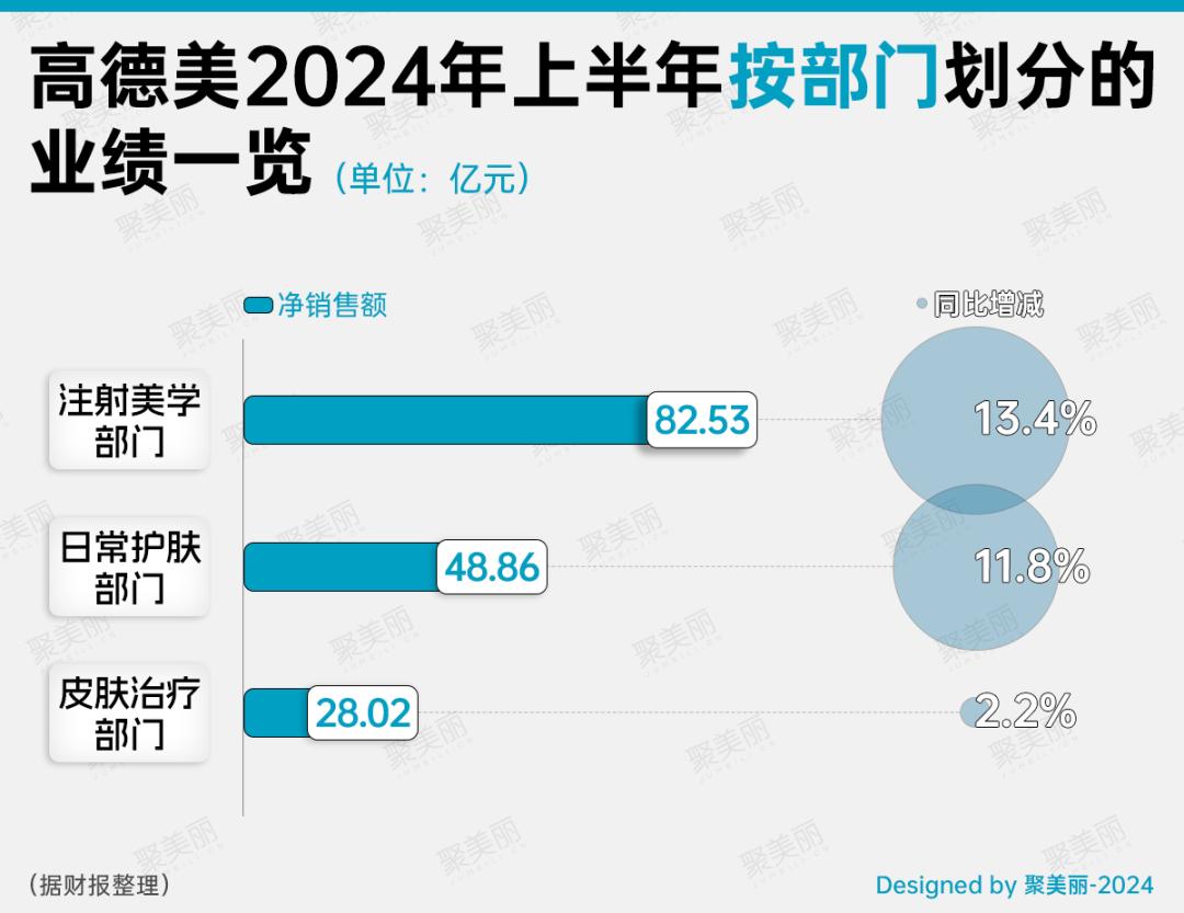 另外,根据公布的最新财务报告数据,2024年上半年,高德美皮肤治疗单位净销售额为3.88亿美元(约合28.02亿元人民币),同比增长2.2%。与注入美学部门和日常护肤单位的两位数相比,皮肤治疗部门的增长较弱。