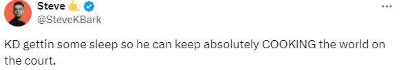 有些球迷说:KD 睡一会儿,这样他就能继续在球场上称霸世界;也有球迷说杜兰特睡觉是为了更好地赢得金牌。