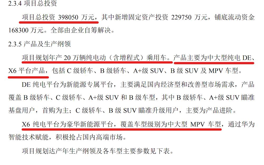 今年3月,安徽省生态环境厅发布了《江淮年产20万辆中高端智能纯电动乘用车建设项目环境影响报告》。报告中的信息显示,该厂预计年产量为20万辆,将开发江淮汽车新能源专属DE平台和华为智能技术赋能的X6平台。