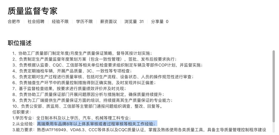 就岗位要求而言,质量相关岗位需具备8年以上高档乘用车品牌系统审核或流程审核等相关工作经验。