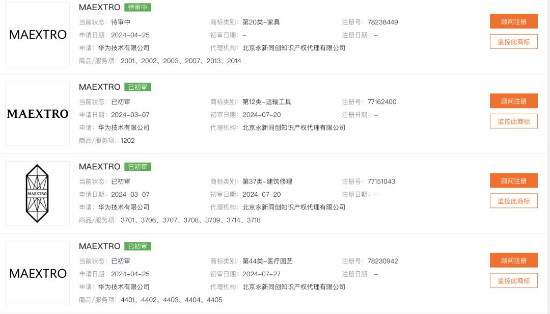 另外,华为还提交了多个与“MAEXTRO"相关商标申请,这些商标具有不同的色彩搭配和字体风格。