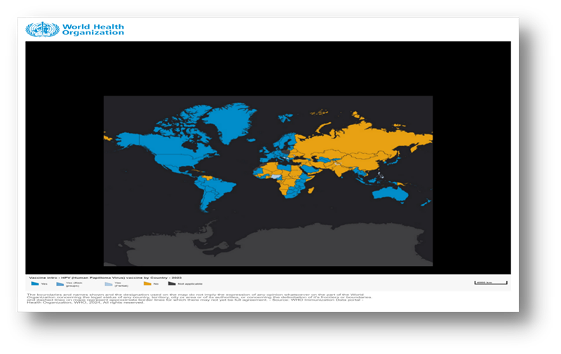 截至2023年12月,在世界卫生组织的194个成员国家中,已有140个(70%)国家将HPV疫苗纳入或部分纳入国家免疫规划(图2),根据WHO和UNICEF对全球HPV疫苗接种及覆盖情况的监测。美洲地区(约91%)与欧洲地区(约85%)的比例较高,而亚洲、非洲等地区的比例较低,这140个国家分布不均。