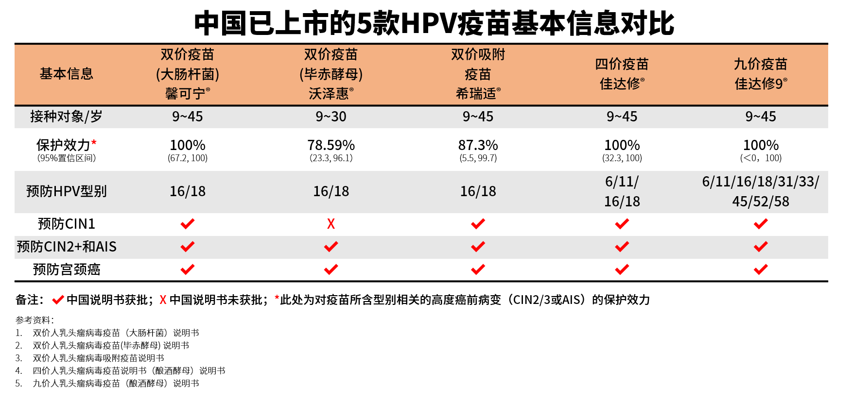 目前,中国已批准上市的5种宫颈癌疫苗对HPV16/18有保护作用。据《华夏时报》报道,根据沃森生物的官网和说明,沃森生物二价HPV疫苗沃泽惠正在预防HPV16、与癌前病变相关的HPV18型保护率为78.59%,但在上述两种亚型的6个月持续感染预防中,相应的数据在其说明书中找不到。说明显示,万泰生物的馨可宁保护率在预防HPV16/18型癌前病变方面达到100%。与此同时,馨可宁还能防止HPV16/182种高危型持续感染。