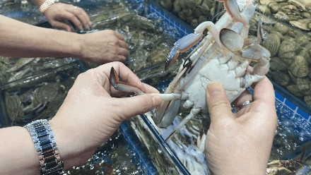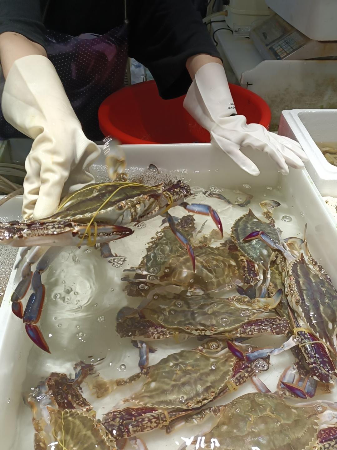 选择梭子蟹的第一步是先称一下重量。一般来说,大小差不多的时候越重越胖,但这并不能保证螃蟹100%肥,所以要结合后面的流程。
