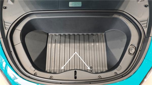 如果前备箱装载液体洒水,前备箱前端上下各有一个过水孔,可以用手拔出橡胶塞排水。如果有少量水滴残留,可以用布擦干。排水后请注意复位橡胶塞(如图所示,右橡胶塞已拔出演示)。