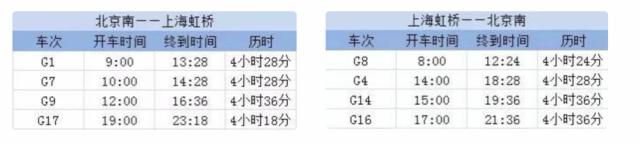 例如,北京南部到上海虹桥。 G1、G7、G9、G17 全部从整个小时开始,大概 4 到上海需要半个小时,很受游客欢迎,客座率很高。从上海虹桥到北京南部 G8、G4、G14、G16 还有整个发班,4 全程跑一个半小时。