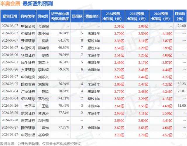 投资建议:米奥展览是中国海外自办展览的领导者,利用国内公司的海风实现了高水平的展位数量增长,并通过系统的展览进行 / 数字化提升整体展览服务能力; / 服务水平 / 该品牌的同频上涨有望进一步巩固米奥作为我国海外自主展览的堡垒。伴随着企业展位数量的稳步增长,企业业绩弹性有望继续释放。预估 2024-2026 年归母净利分别为 2.5/3.2/4.0 亿元,对应 PE 分别是 保持“推荐”评级,14x/11x/9x。