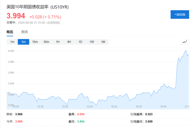 美国首申数据公布后,美国国债利率上升,其中10年期国债收益率为3.994%,上升0.71%。