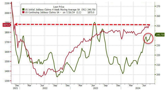 然而,截至8月3日当周,续约失业救济人数已上升至187.5万人,创下2021年11月至今的新高。续约失业救济的周边平均人数也创下新高。