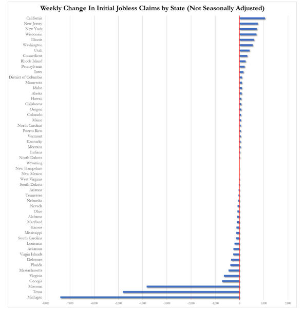 数据显示,密歇根州、密苏里州和德克萨斯州的申请人数减少是由于密歇根州、密苏里州和德克萨斯州的申请人数在过去几周大幅增加。