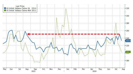 根据美国劳工部8月8日周四公布的数据,8月3日本周,美国首次申请失业救济的人数为23.3万人,低于预期的24万人,低于之前的24.9万人。今年大部分时间,申请失业救济的人数都在上升。