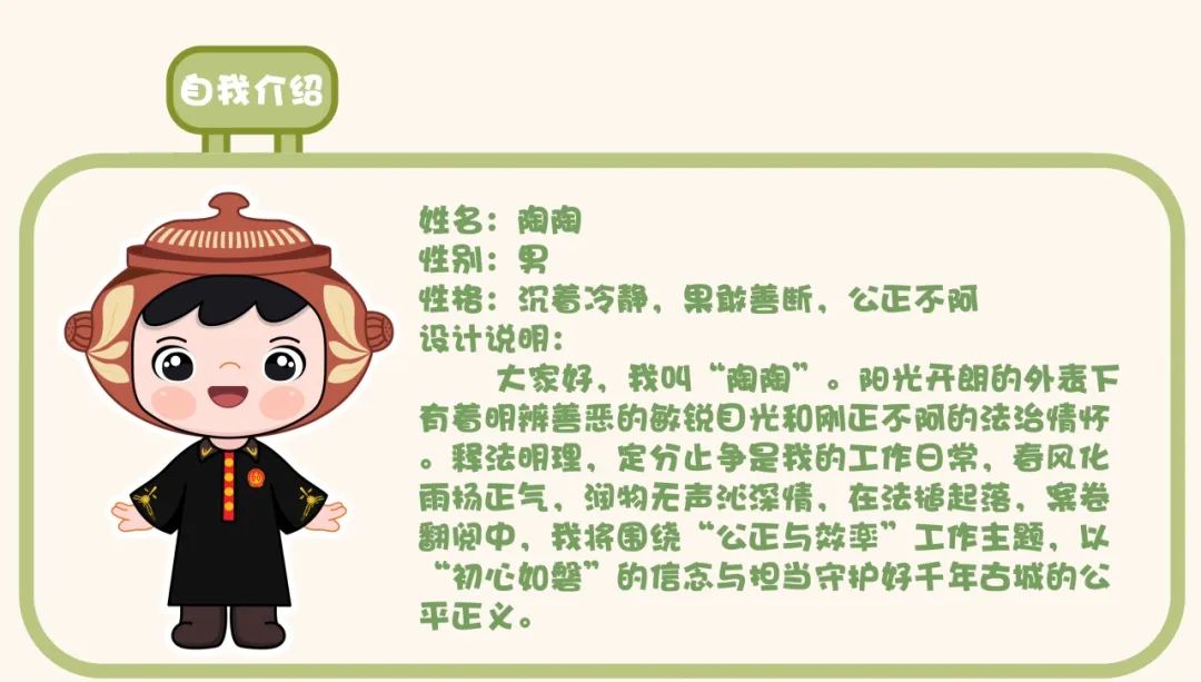 “陶陶”法官的设计理念与“非物质文化遗产”和现代司法元素相结合,将建水紫陶独特的汽锅容器与法官形象相结合。紫陶“坚如铁,明如水,润如玉,声如玉”的美称,补充了人民法官诚实、忠于人民、忠于人民的坚毅品格。“陶陶”整体发饰为汽锅,其古朴典雅、圆润端正的神韵,寓意着法平如水、德正如山的坚定信念。装饰莲花图案,取清荷“廉”意,以陶彰廉,寓意将公正廉洁融入血脉,锻造新时期忠诚廉洁的政法铁军。莲花与汽锅的巧妙结合,“荷汽”谐音“客气”,意思是将“和谐为贵”、“礼法合治”等儒家优秀传统文化运用到审判执行中,让温馨的“和谐”风格渗透到家家户户中。