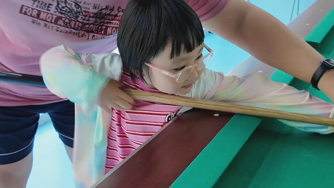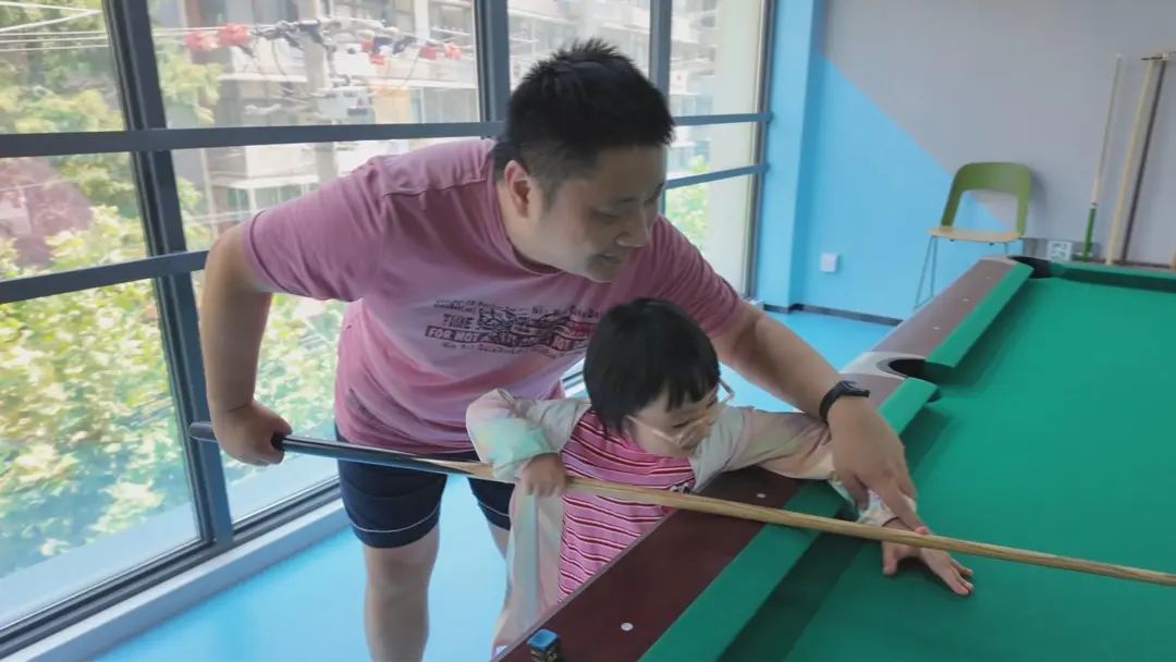 卢先生一家三口去体验打桌球,小女儿才4岁。、5岁的时候,但是在父亲的指导下,举起杆子已经很像样了,很兴奋。“就在我休息的时候,我们决定一家人来这里玩一会儿桌球。恰好是全民健身日,免费开放。让女儿在这里玩,大家都开心。乒乓桌满了。如果你不满意,你会打乒乓球一会儿。”
