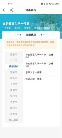 进入赣服通入学专区,选择“景德镇市”,点击“中心城区入学一件事(小升初)”