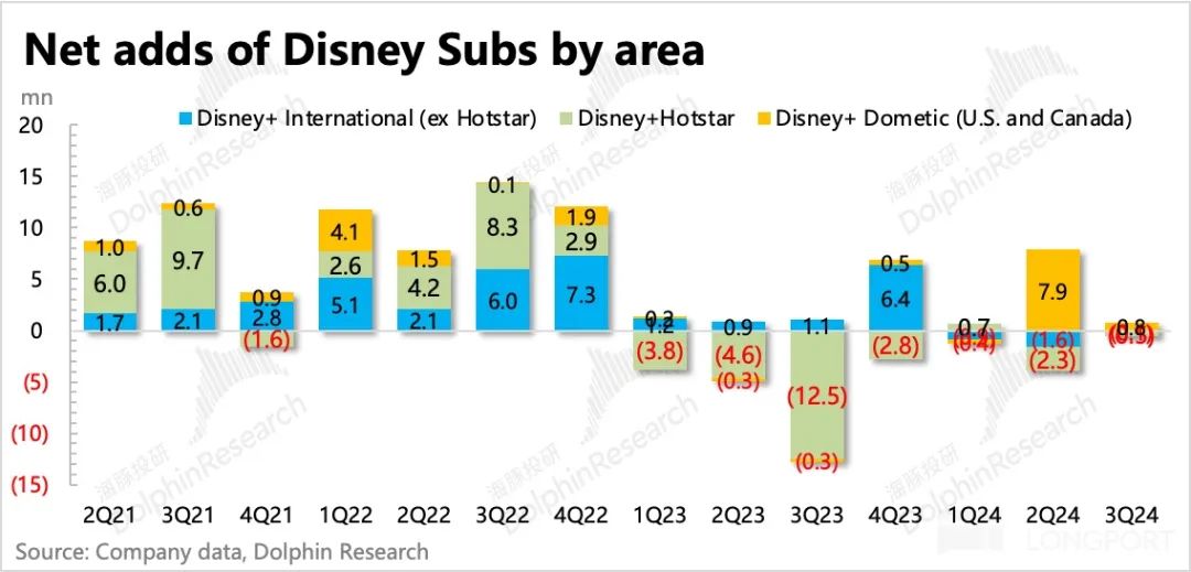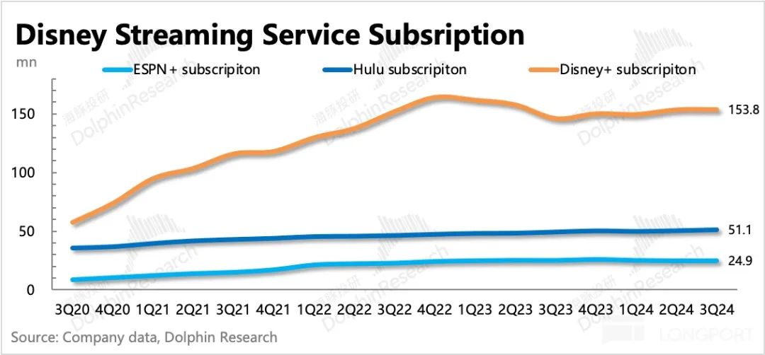 虽然第三季度内容支出同比持续下降,但下降幅度明显放缓。考虑到多个季度储备内容短缺,公司似乎有内容投资触底、回归扩张的迹象。从变化趋势来看,迪士尼的投资节奏和奈飞差不多。这一次,由于自身的盈利能力,新的投资周期可能比奈飞晚一点。