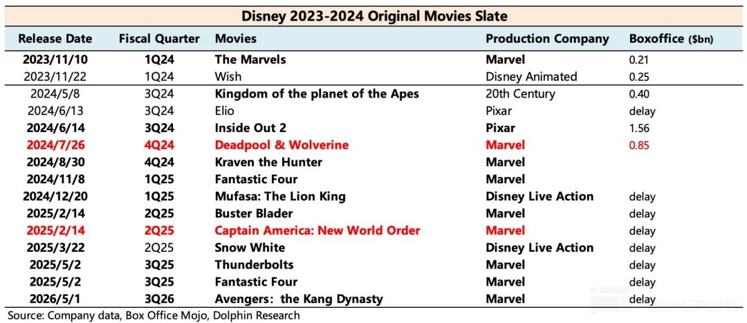 但是海豚君估计,2025 财年会看到一些与运营相关的投资支出增加,尤其是内容投资。在过去的几年里,主动减肥是因为 由于好莱坞罢工的影响,迪士尼储备不足的问题已逐渐显现出来——多部新电影的上线日期一研再延。