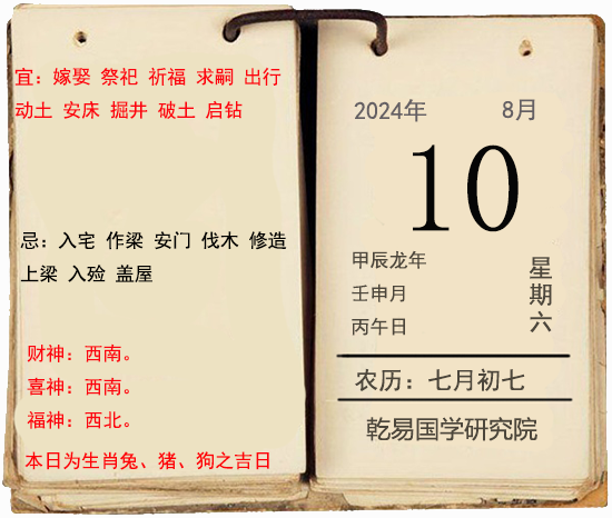 一、时间:阳历:2024年8月10日;阴历:【龙年】七月初七;年次:甲辰龙年 壬申月 丙午日。
