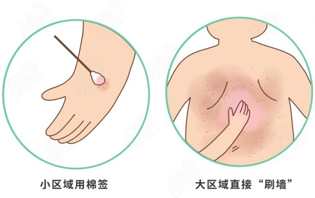 如面积小,可用棉签均匀涂抹;如面积较大,父母可用粗棉签或清洁手后,直接用手指给孩子涂抹。