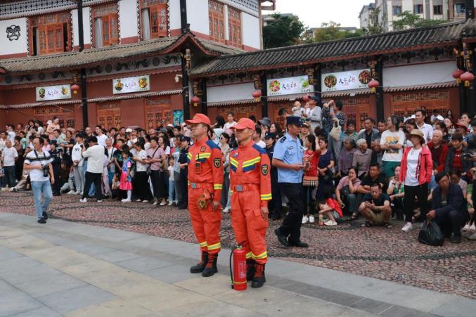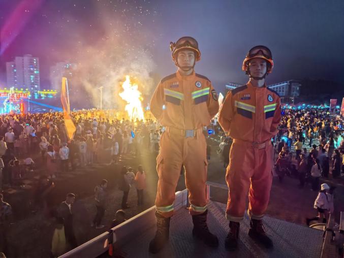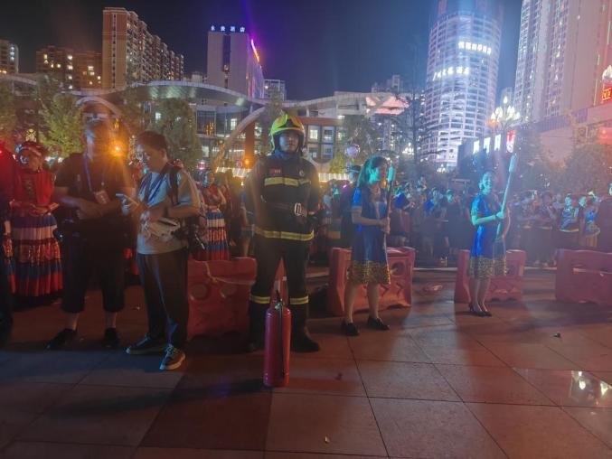 七月二十二日,“自然凉·毕燃嗨·活力金沙” 金沙县岩孔街道贡茶古镇广场举行彝族火炬狂欢节,金沙县消防救援大队在活动现场值班,守护安全。