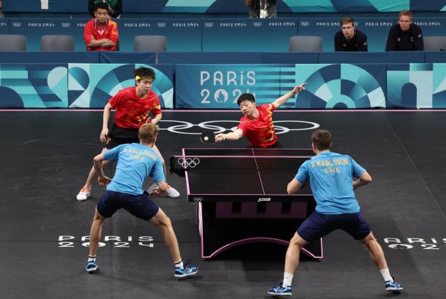 8 月 9 日本,马龙(上右)/中国队 科尔贝里里王楚钦(上左)和瑞典组合 / 在赛场上,卡尔松(下右)。马龙 / 王楚钦 3 比 2 击败科尔贝里 / 新华社记者卡尔松 赖往东 摄