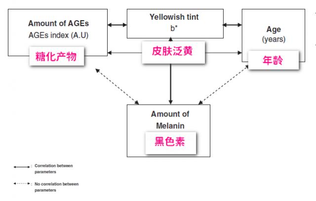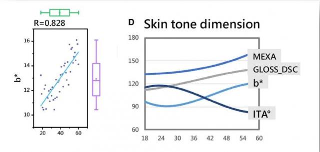 试验对皮肤暗沉水平(b 值)对其进行了详细的分析,发现并进行了分析年纪的相关性高得惊人,几乎呈现出一条直线。
