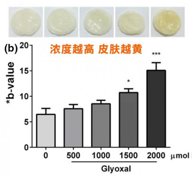 更加直观的研究:直接使用引起糖化的乙二醛对离体皮肤进行浸润,浓度越高,肌肤黄得越明显,真的就像烤面包一样,机制也差不多(美拉德反应)。