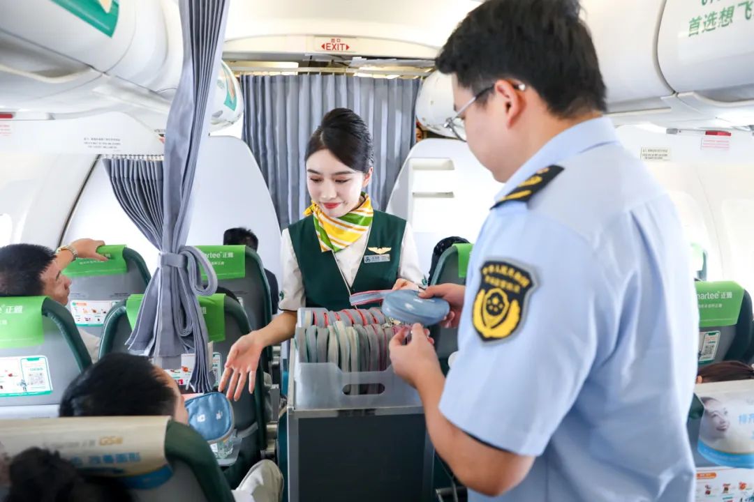 在主题航班机舱内,相关人员带领旅客了解旅游目的地的安全和健康,并开展有奖问答、发放宣传资料等活动,帮助旅客增加消费者权益保护知识,宣传健康旅行的知识和理念,引导他们树立健康的消费观念。