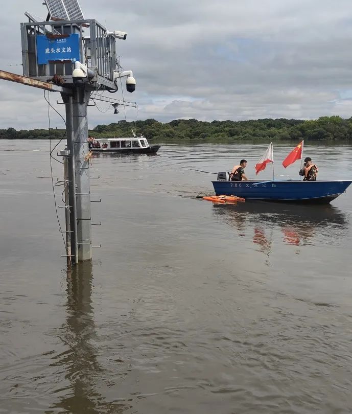 8月6日,乌苏里江主流水位超保,松辽委水文局中游中心干部职工抢测虎头站水位数据,为防洪提供有力支持。拍摄:吴高庄