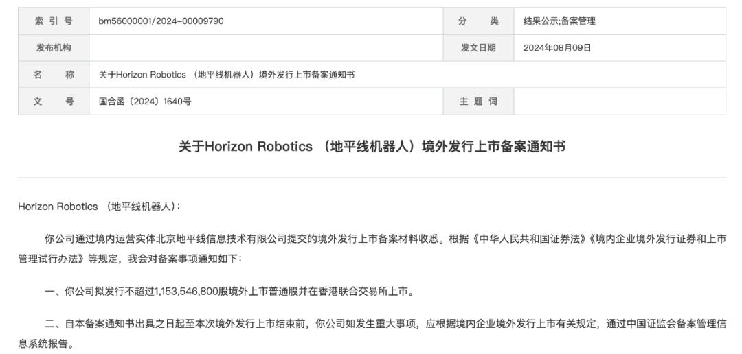 地平线是今年3月底向香港证券交易所提交的招股书,未来一段时间没有更多相关声音。通过中国证监会海外上市备案,证明其上市步伐进一步加快。