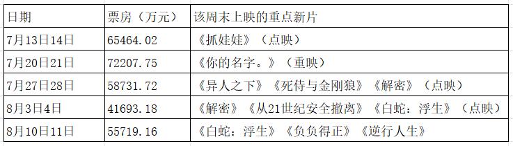 首先,从电影市场来看,从今年的奥运会到7月27日到8月12日,开始和结束只是两个周末。周末也是一周中期电影市场的高潮。我们不妨用几个周末的市场数据来做一个。 简单对比。