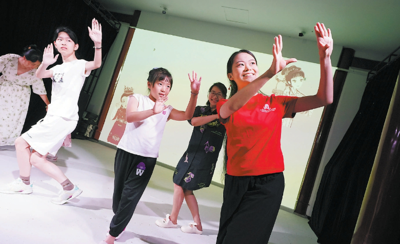 利用表演间歇,团员胡靖仪向观众介绍了越剧的相关知识,并带大家亲身体验了越剧的表演形式和特点。