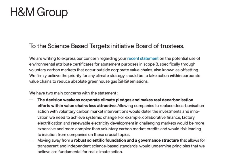 潮流型品牌H&M之前一直是SBTi的支持者之一,但是今年五月,H&Leylala集团可持续发展主管 Ertur直接致函SBTi,提出反对意见。