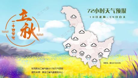 18日晚至19日白天:齐齐哈尔南部、大庆、绥化南部、哈尔滨东部、牡丹江有小到中雨,局部有大雨。哈尔滨西部、七台河、鸡西部阴天有阵雨或雷暴,其他地区阴天。