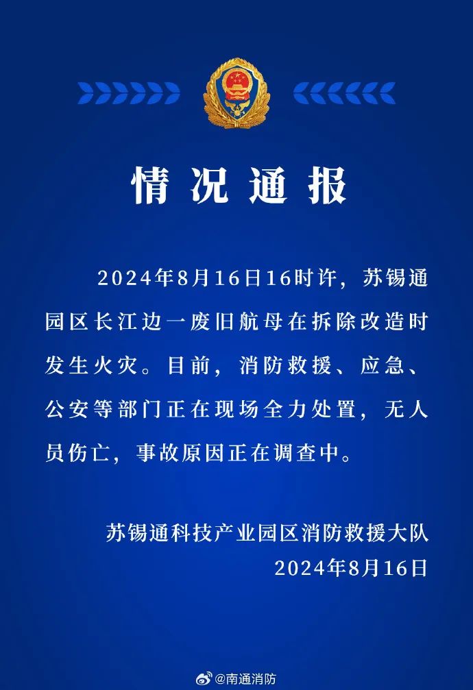 根据江苏省南通市消防救援支队官方微博,2024年8月16日16时许,苏锡通园区长江边一艘废弃航母在拆除改造过程中发生火灾。