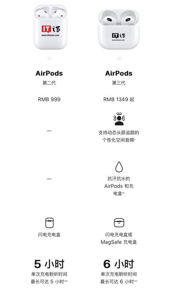 作为比较,IT 世家得知苹果官网现金在售。 AirPods 2 国行耳机价格为 999 元,而 AirPods 3 国行耳机价格为 1349 元起,具体区别如下: