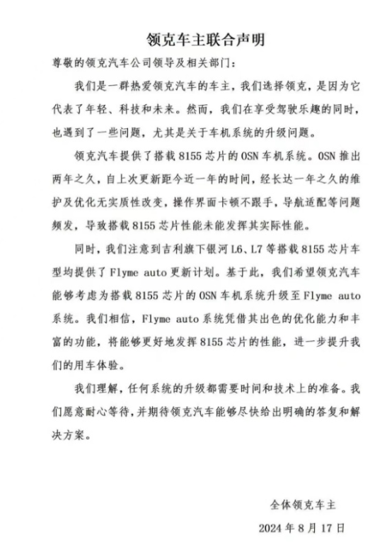 这份联合声明反映了领克车主对更高品质汽车感受的需求。随着智能汽车技术的不断发展,客户越来越重视车载信息娱乐系统的便利性和功能性。领克车主希望通过这一呼吁,更加关注用户反馈,加快系统改进。
