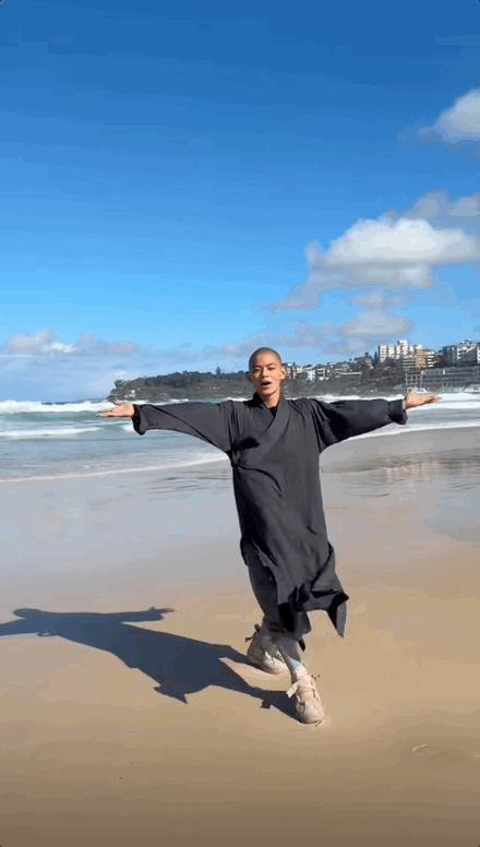 最后一段视频,站在悉尼的海岸线上,在海浪中表演中国功夫。