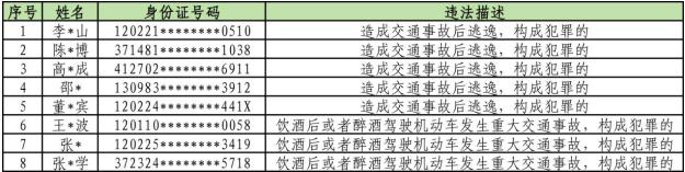 本次公布的8名终身禁驾人员均为男司机,年龄最大的66岁,年龄最小的30岁。其中,5人因交通事故逃逸构成犯罪,被依法追究刑事责任,吊销机动车驾驶证,终身不得再次申请驾驶证;3人因饮酒或醉酒驾驶机动车重大交通事故构成犯罪,被追究刑事责任,吊销机动车驾驶证,终身不得再次申请驾驶证。