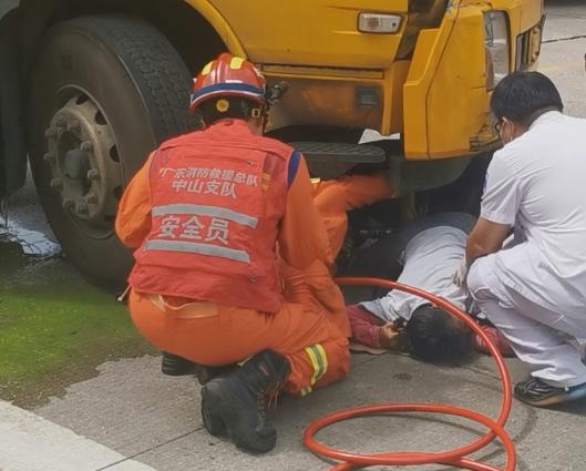 该女子的小腿被卡车右前轮压着