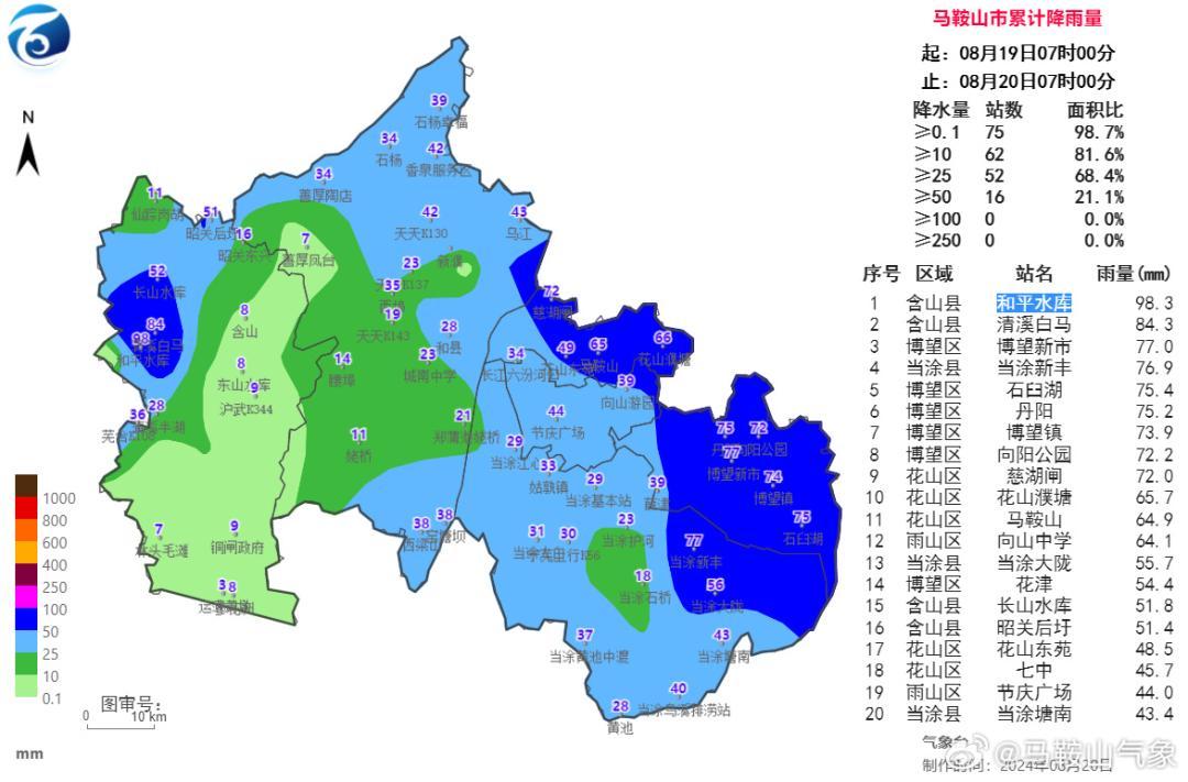 2024年8月20日7时,马鞍山市气象台公布了实际雨量和天气预报:在过去的24小时里,我市出现了雷雨,雨量分布不均,累计雨量超过25毫米的52个站点,其中累计雨量超过50毫米的16个站点,最大的含山和平水库98.3mm;四站小时雨强超过40mm/小时,最大当涂新丰49.77mm每小时(19日19-20时);三站阵风7级,最大当涂塘南14.3米/秒。