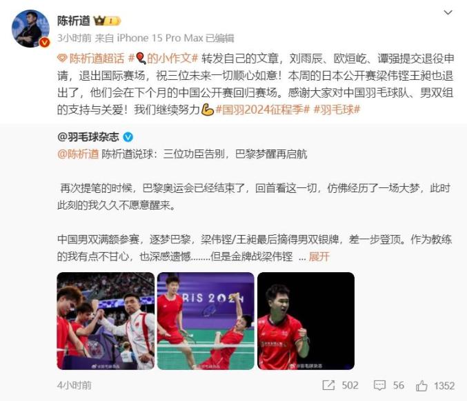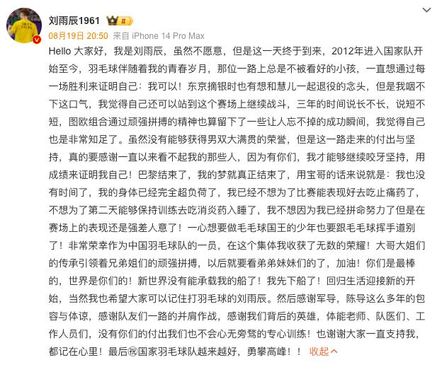 接着,国羽男双队员刘雨辰发文回应退出国家队。