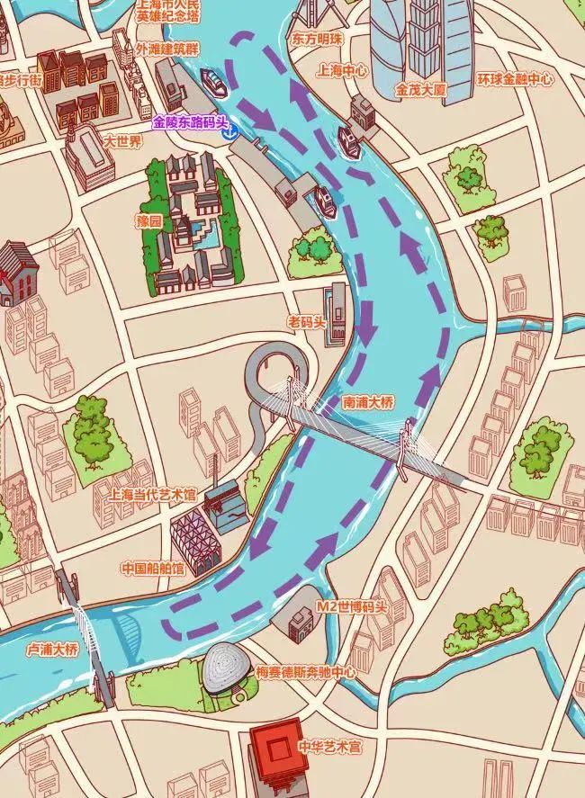 从金陵东路港口出发,乘坐浦江快线游览航道,回顾全国建筑博览群,欣赏浦东开发开放30年的成果之一,俯瞰16家老码头,穿越南浦大桥... 最后在卢浦大桥周围折回。整个过程大约需要60分钟。