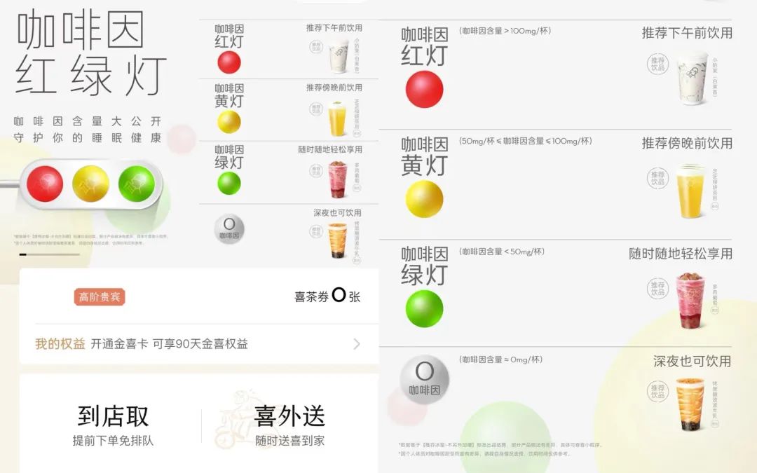 此次公示,喜茶将饮料中的咖啡因含量分为四个等级:无咖啡因、绿灯、黄灯和红灯: