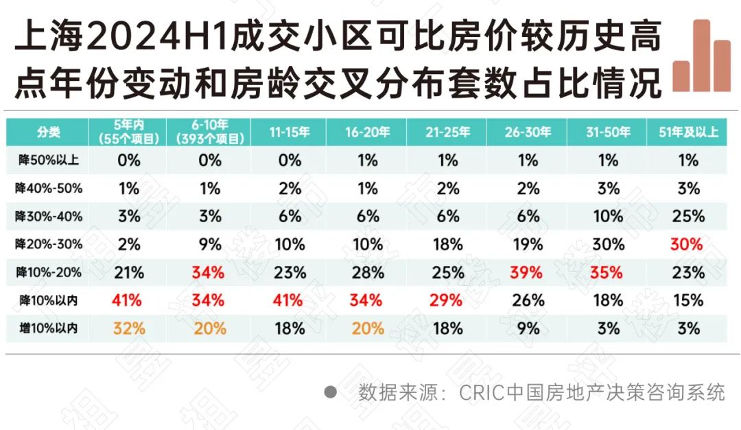 总的来说,对5个城市的样本社区的房龄和房价涨跌进行交叉分析,说明房龄越老,跌幅越大。次新房(房龄在10年以内)房价跌幅明显低于老旧社区(房龄在30年以上),2024年上半年房价跌幅在20%以内的房龄在5年以内64%左右。对于30年以上的老旧社区,30%左右的跌幅集中在20%-30%。