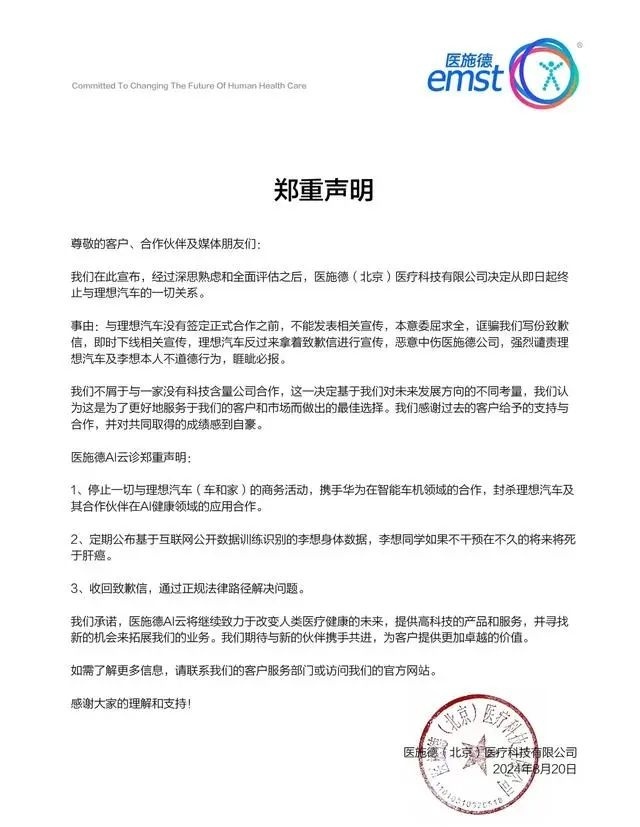 据三言科技报道,DoNews8月20日报道, 月 19 日前,网友在社交平台上发布了《关于医施德与理想汽车的声明》,称从现在开始,所有与理想汽车的关系都将终止。
