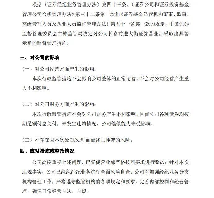 吉林监管局指出,吉林监管局根据《证券经纪业务管理办法》第四十三条、《证券公司与证券基金管理公司合规管理办法》第三十二条第一款、《证券基金经营机构董事、监事、高级管理人员及从业人员监督管理办法》第五十一条第一款的规定,决定对东海证券长春前往街道的证券营业部采取监督管理措施,出具警示函。