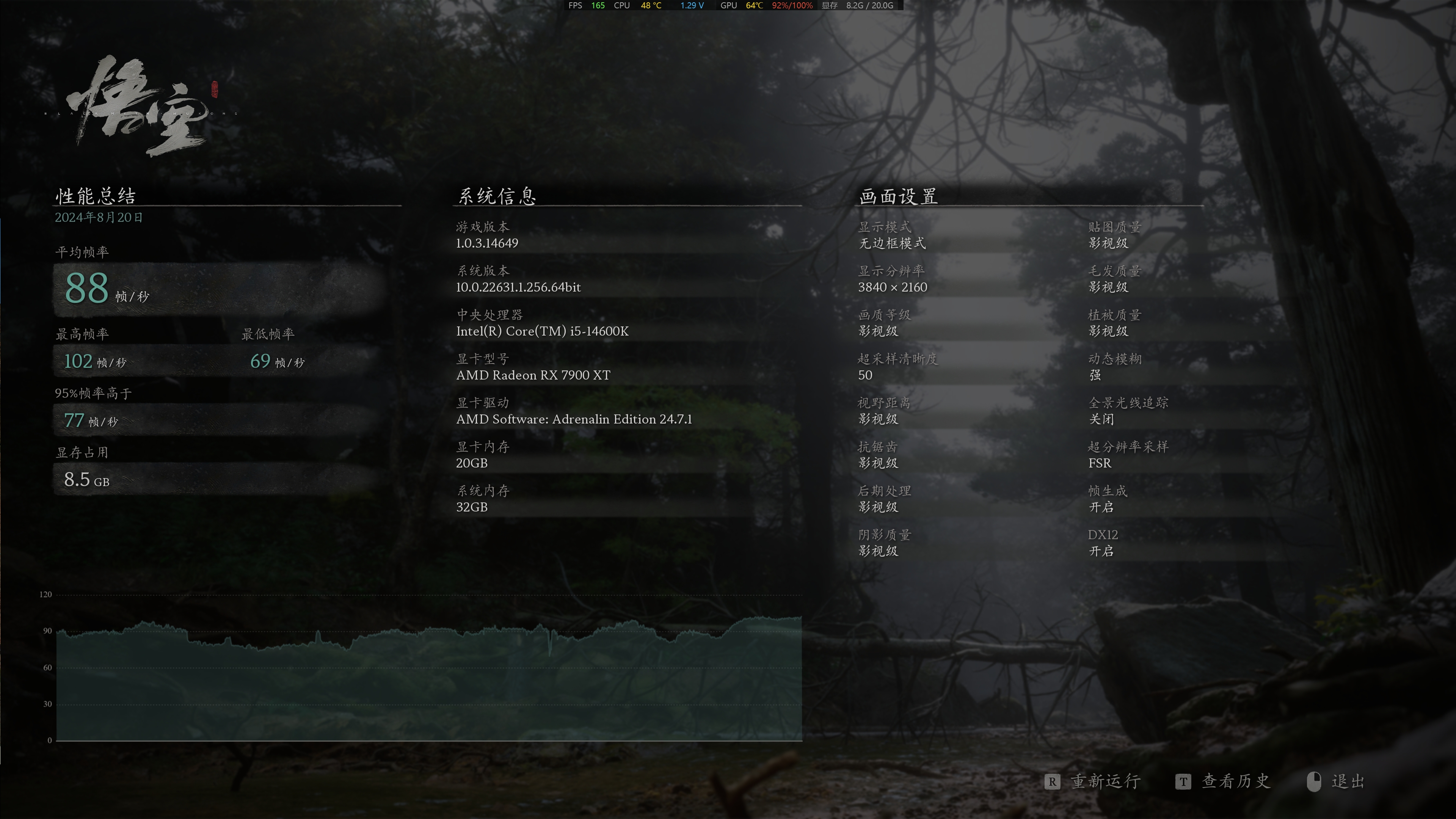 影视级画质在4K分辨率下所给予的压力确实很大,当超采样清晰度调整到50时,整个影视级设置,平均帧数为88,最高帧数为102,最低帧数为69,总的来说,满足流畅的游玩是没有问题的。