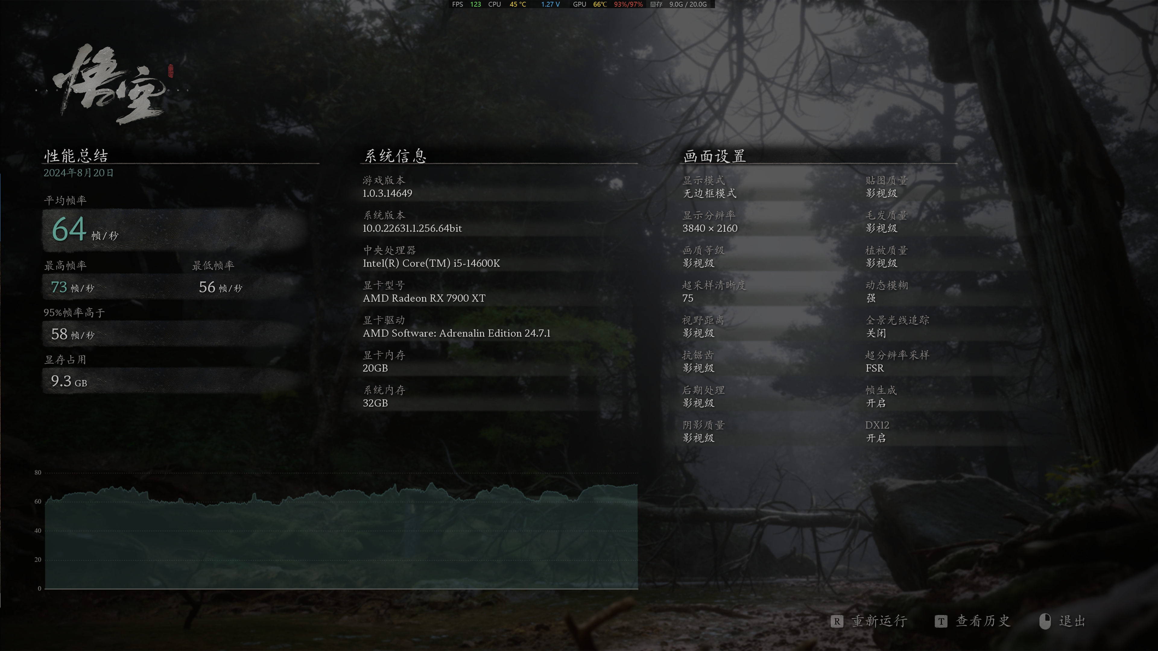 在游戏中也可以看到,只有打开/关闭帧才能生成功能,游戏的帧数可以相差近一倍。比如在FSR模式下,打开前的平均帧数是64,关闭后的帧数只有37。