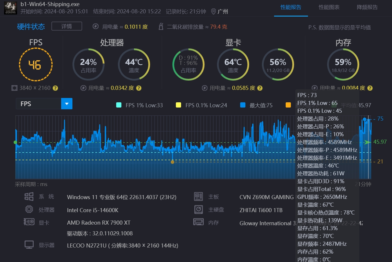 事实上,这种配置进入游戏后,在孙悟空大战二郎真君的开场景中,帧数基本上在30-40fps左右,只有测试时的一半。然而,在云对抗结束后,帧数迅速回到接近测试时的值,并保持在70-80fps之间,基本上可以在没有压力的情况下顺利玩耍。