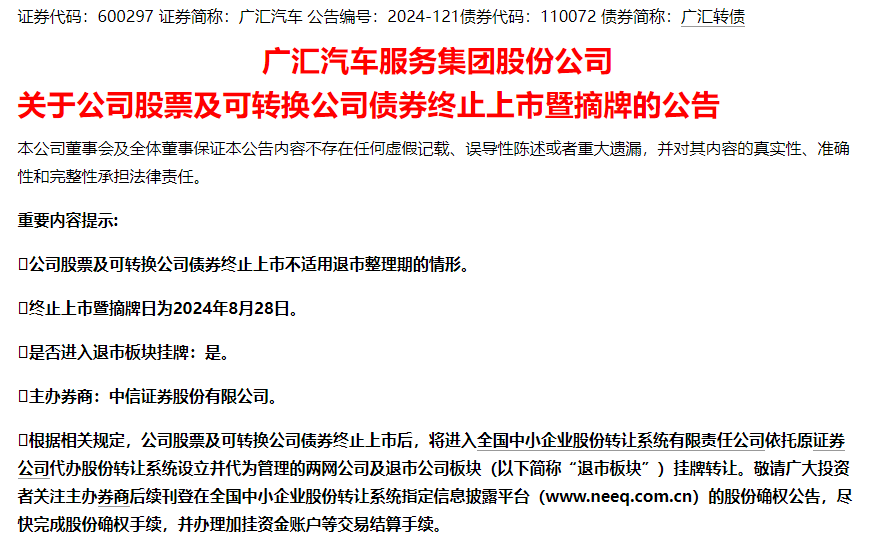 广汇汽车决定退市,8月28日公司股票和可转债退市。